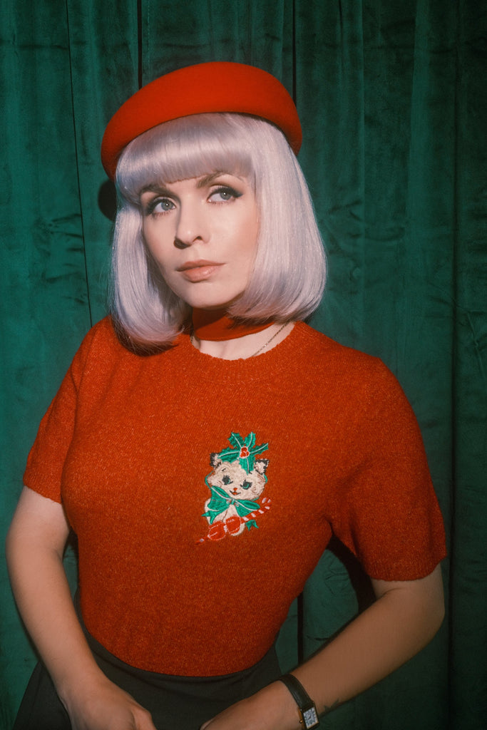 Candy Cane Kitten Short Sleeve Relaxed Sweater in Red