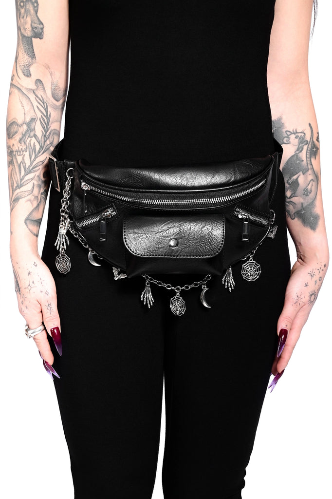 Black vegan leather fannypack with spooky charms attached along a chain on the bottom.