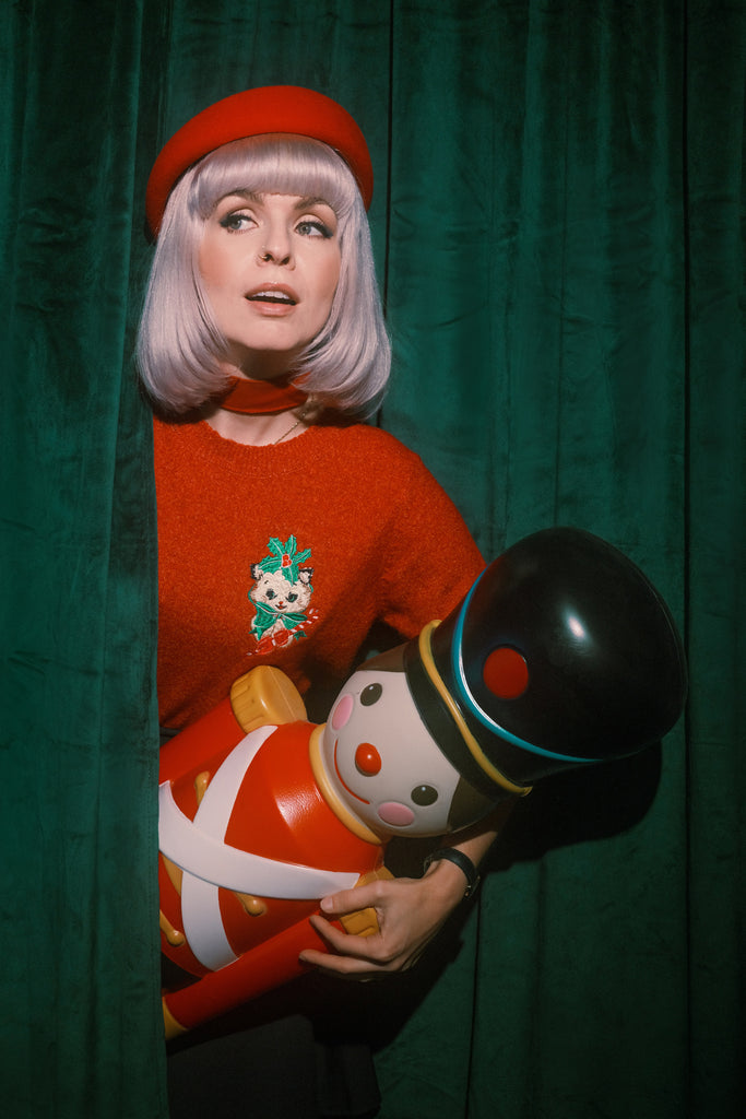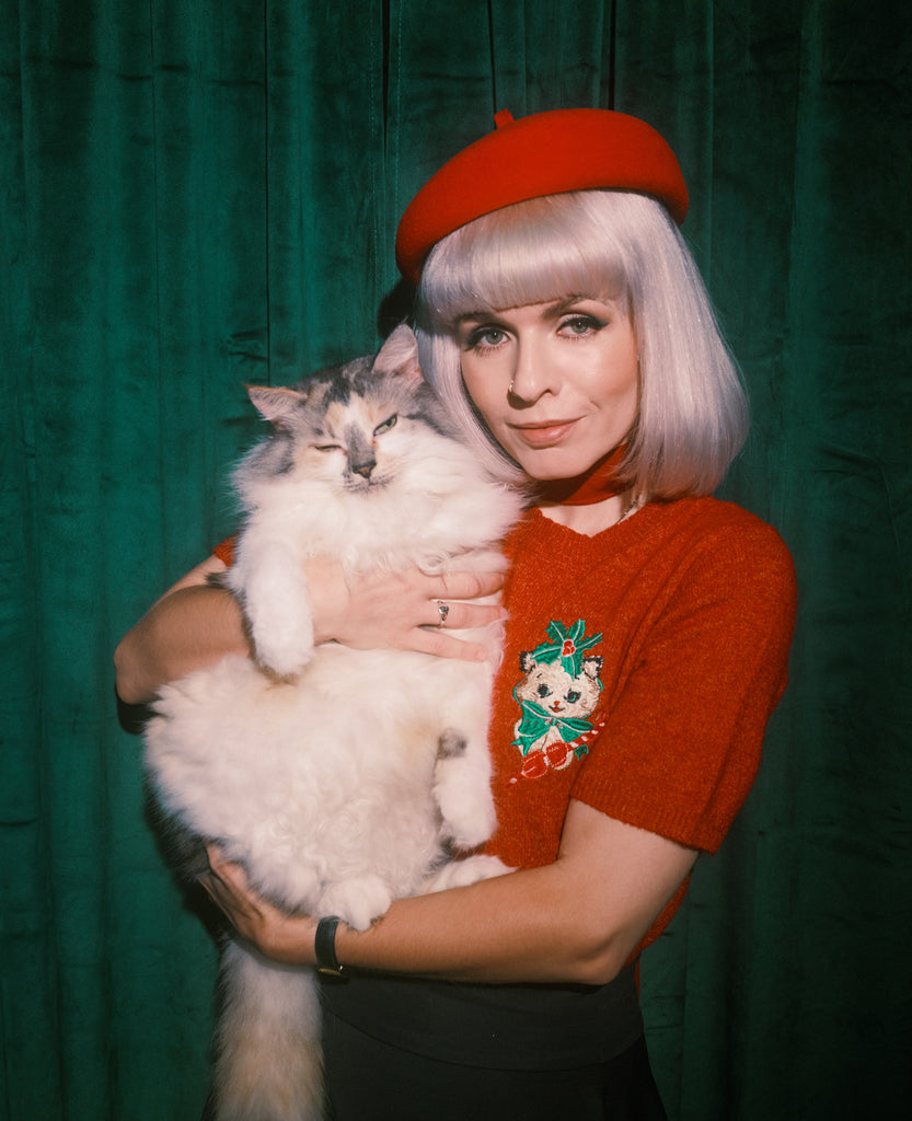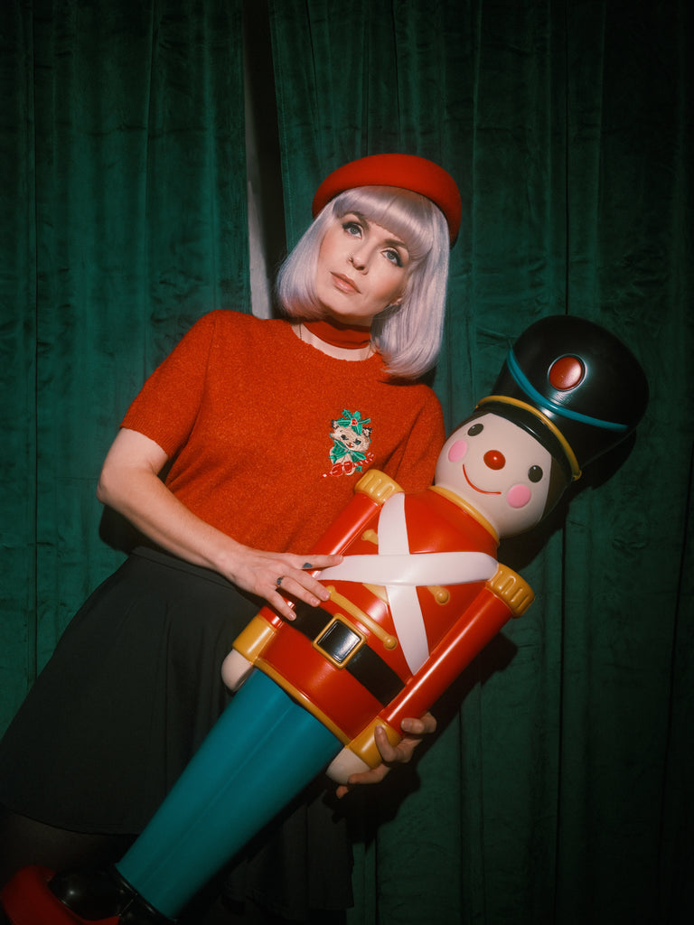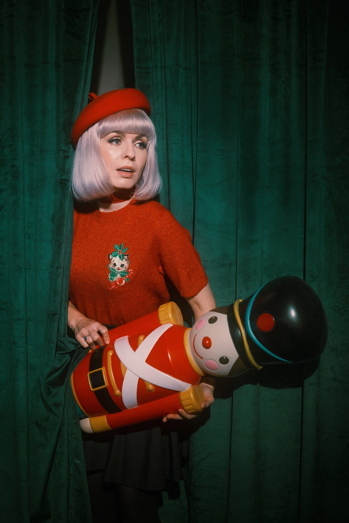 Candy Cane Kitten Short Sleeve Relaxed Sweater in Red