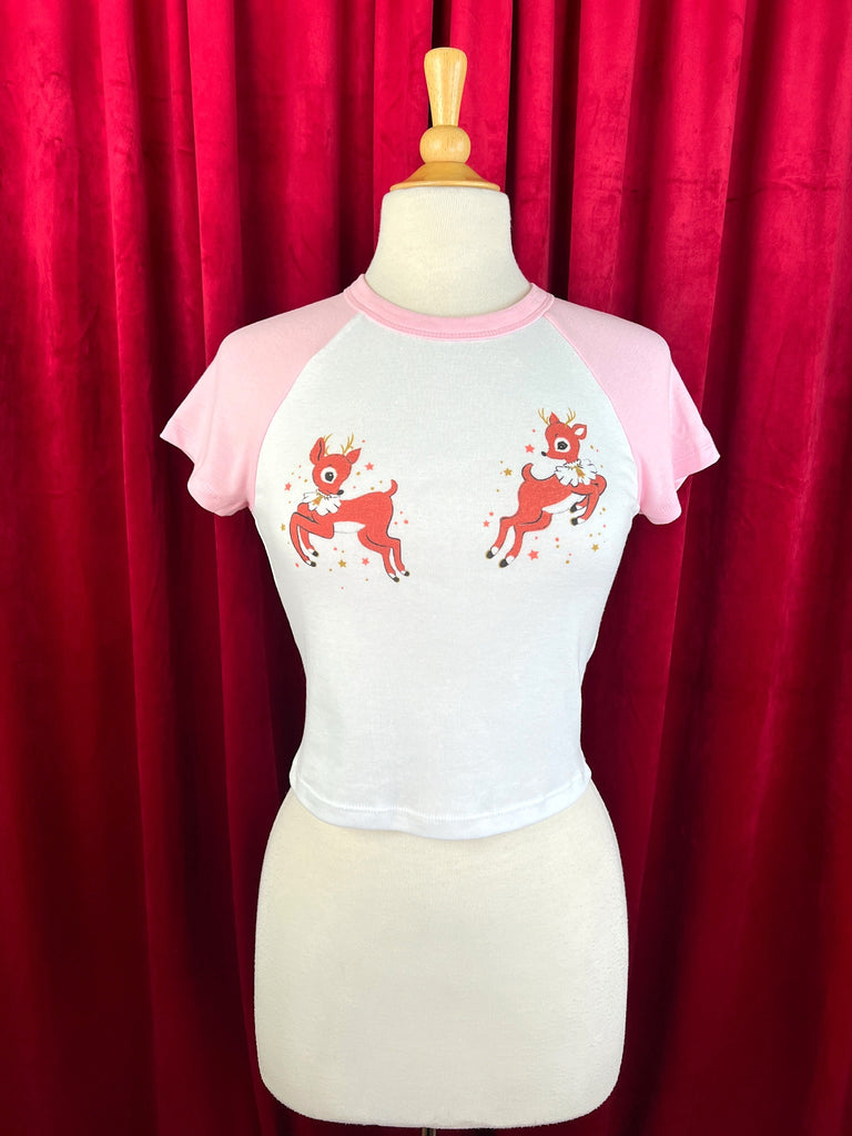Stella Deer Short Raglan Cropped Baby tee in White/Pink